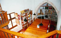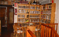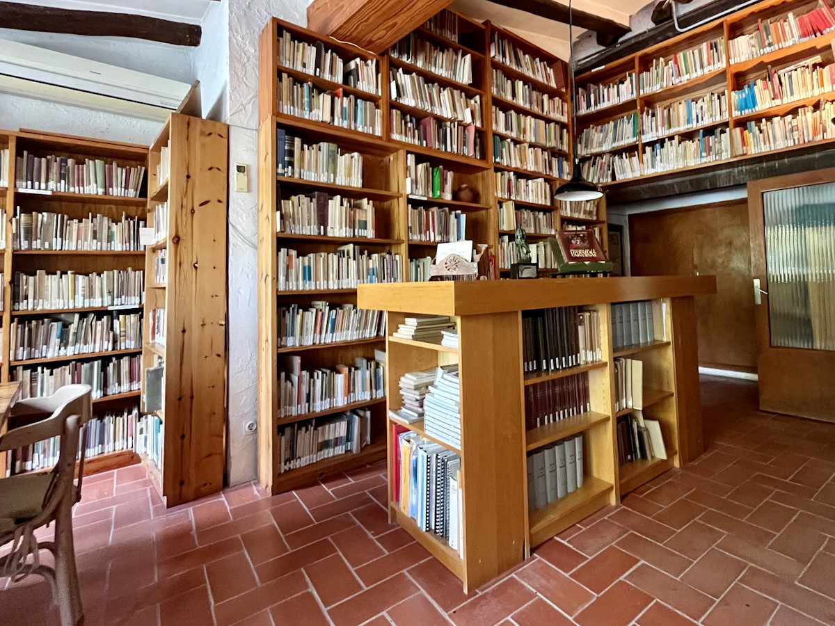 Al vestíbul, on seria l’entrada de la biblioteca, a una banda hi ha les obres generals: enciclopèdies, obres de referència, etc., i a l’altre costat, per raons de funcionalitat, els diccionaris lingüístics.